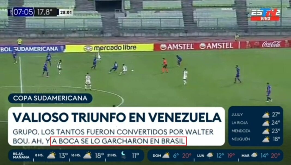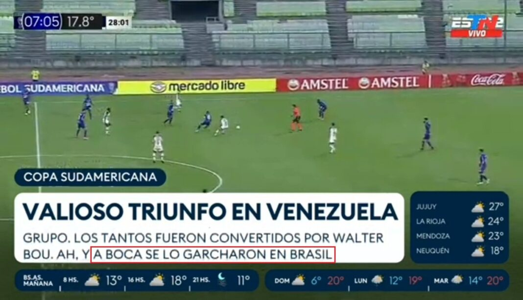 Es que en los denominados zócalos que ocupan la parte inferior de la pantalla, y que generalmente tienen un resumen de lo que se lee al aire, alguien “metió la pata” hasta el fondo. Luego de la lectura sobre el triunfo de Lanús, seguidamente se vio la siguiente frase: “Ah, y a Boca se lo garcharon en Brasil”.