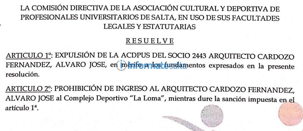 Finalmente, este jueves se dio a conocer la sanción por parte de la Comisión Directiva de la Asociación y Deportiva de Profesionales Universitarios de Salta. Estos, determinaron que Álvaro Fernández, fue expulsado de la Asociación.