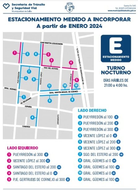 En la actualidad, Salta cuenta con 400 cuadras con estacionamiento medido, donde se abonan 150 pesos por hora. Con la expansión, se sumarán 46 cuadras adicionales en el Paseo Güemes y Tres Cerritos. La medida tiene como objetivo regularizar la situación de los permisionarios y combatir la informalidad que prevalece en horario nocturno.