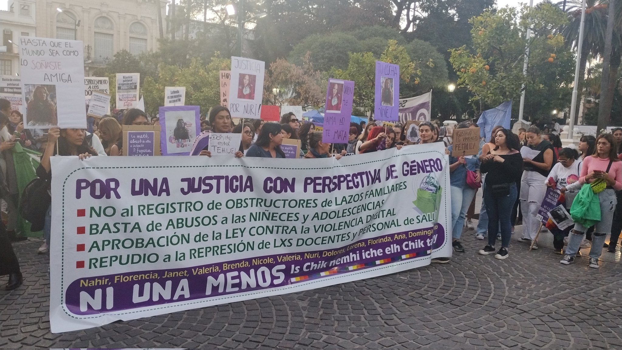 DNI Salta.- La multitudinaria marcha del octavo aniversario del Ni Una Menos en Salta tuvo también un fuerte contenido a favor de la lucha de la docencia y de los trabajadores de la salud, y en contra de la «ley anti-protesta», que avasallará los derechos al reclamo de los salteños, aprobada por los diputados y senadores provinciales alineados a Gustavo Sáenz; y también con un alto repudio a otra ley polémica y escandalosa, la del Registro de Obstructores de Lazos Familiares impulsada por el senador saencista Emiliano Durand.