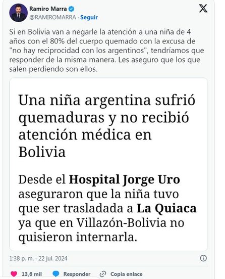 La denuncia, ampliamente difundida en redes sociales, reavivó el debate sobre la reciprocidad en la atención médica entre Argentina y Bolivia, incluso provocando una reacción del legislador argentino Ramiro Marra. «Si en Bolivia van a negarle la atención a una niña de cuatro años con el 80% del cuerpo quemado con la excusa de ‘no hay reciprocidad con los argentinos’, tendríamos que responder de la misma manera», expresó Marra en su cuenta de X.