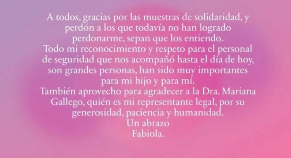DNI Salta.- La ex primera dama, Fabiola Yañez, utilizó su cuenta de Instagram para expresar su agradecimiento por las muestras de solidaridad recibidas tras denunciar al ex presidente de la Nación, Alberto Fernández, por violencia de género.