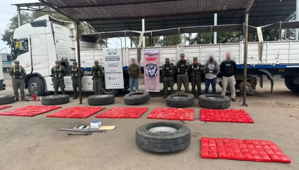 DNI Salta.- Tras tres meses de investigación, Gendarmería Nacional desbarató una maniobra de narcotráfico que utilizaba un esquema de tres vehículos: una camioneta para ingresar el estupefaciente, otra como “puntero” y finalmente un camión para el transporte. El cargamento fue descubierto en neumáticos rellenos con cocaína.
