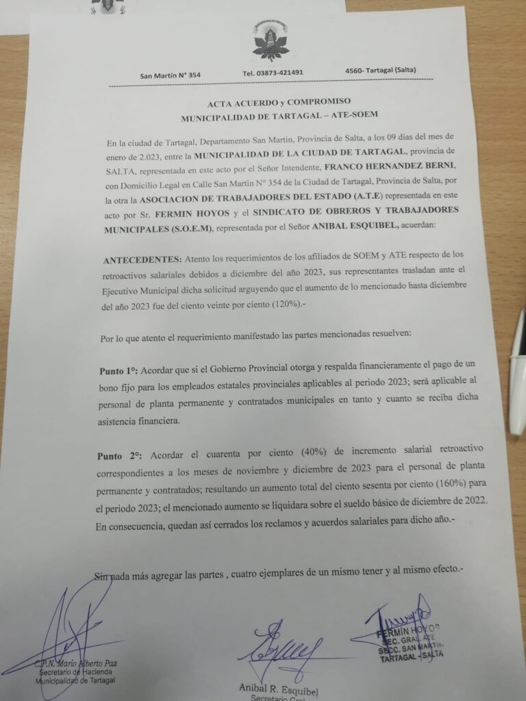 DNI Salta.- Aumento salarial Tartagal. El pasado viernes, la gestión municipal cumplió con el compromiso de abonar el aumento retroactivo del 40% correspondiente a los meses de noviembre y diciembre, consolidando así un significativo aumento del 160% en el salario de los trabajadores municipales a lo largo del año. Este logro posiciona a Tartagal como el municipio con los sueldos más altos de la provincia.