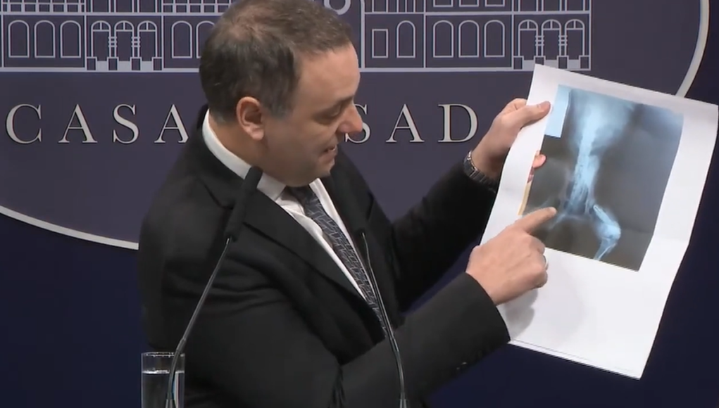 El vocero mostró en la conferencia de prensa la imagen: “Vean la radiografía del perro que se usó para que otorgaran la pensión tiene la cola del perrito. Con esto otorgaron una pensión por invalidez”.