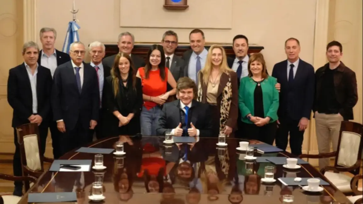 Entre los presentes estuvieron los ministros Luis Caputo (Economía), Mario Lugones (Salud), Sandra Pettovello (Capital Humano), Mariano Cúneo Libarona (Justicia), Patricia Bullrich (Seguridad) y Luis Petri (Defensa), además de Karina Milei, María Ibarzabal Murphy, Martín Menem, Santiago Bausili y el asesor presidencial Santiago Caputo, quien fue el único en evitar las cámaras durante la foto oficial previa al encuentro.