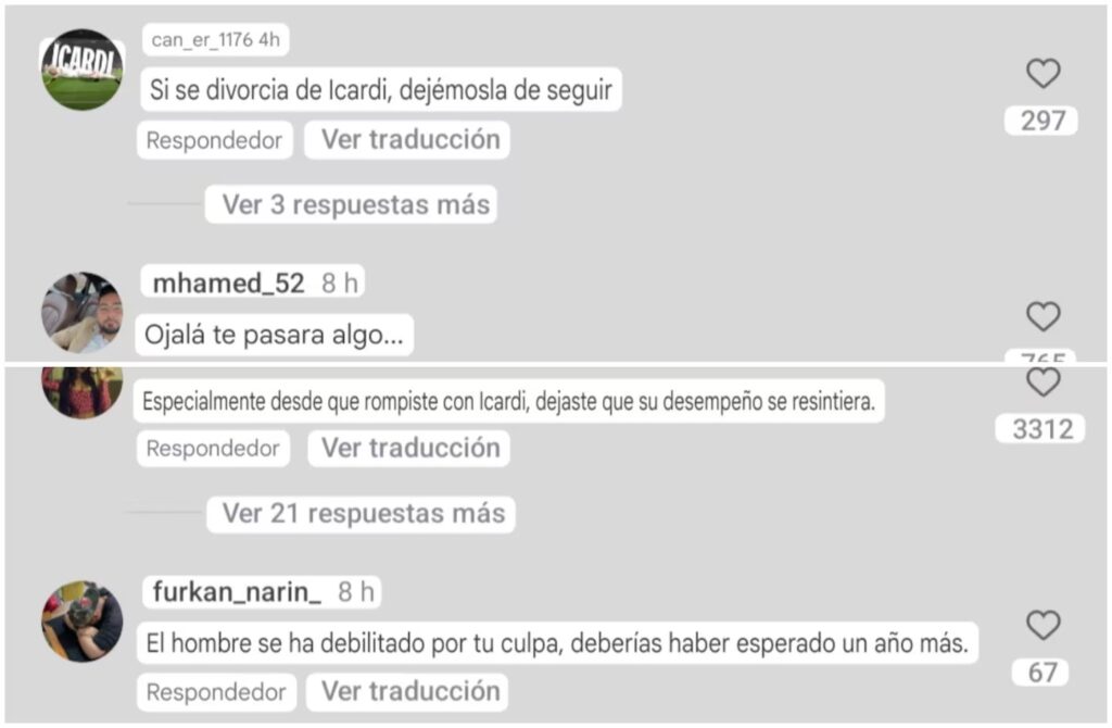 “Ojalá te pasara algo”, le escribió un usuario en turco y se sumó a los cientos de mensajes que Wanda recibió desde el país donde juega su expareja. “Si se divorcia de Icardi, dejémosla de seguir”, propuso otra persona en la última publicación que ella subió a su Instagram.