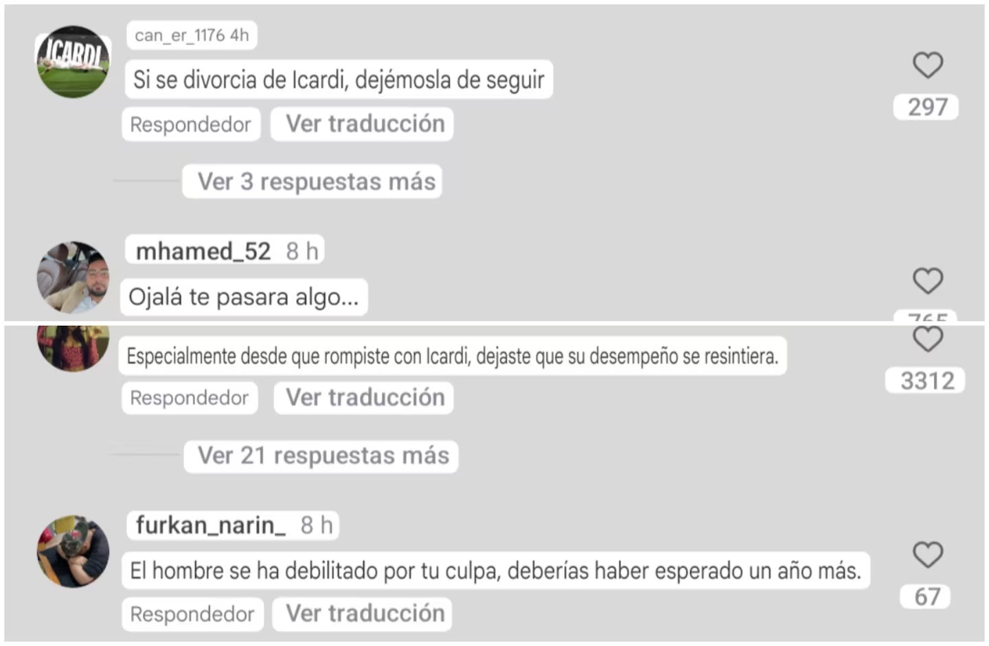 “Ojalá te pasara algo”, le escribió un usuario en turco y se sumó a los cientos de mensajes que Wanda recibió desde el país donde juega su expareja. “Si se divorcia de Icardi, dejémosla de seguir”, propuso otra persona en la última publicación que ella subió a su Instagram.